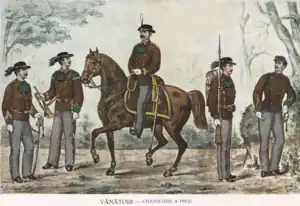 ![]() 1930 drawing of uniforms of the Vânători. Reproduced after "Albumul Armatei Române", 1873 | |