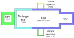 In 1686, the church nave was expanded westward, with the masonry in the original eastern parts preserved. Afterwards, the total length of the church measured 64 metres (210 ft). From 1739 to 1742, the church underwent a large renovation project. During this time, a new tower with a flat roof was built on the west end. In 1779, the roof of the tower was changed to have a pyramid-shaped roof with a new spire on top. Throughout the 1700s, the church transitioned into having baroque decor.[6][7][5]