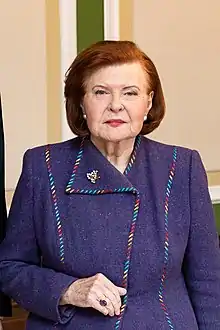 Vaira Vīķe-Freiberga OQ (born 1 December 1937) is a Latvian politician who served as the sixth President of Latvia from 1999 to 2007. She is the first woman to hold the post. She was elected President of Latvia in 1999 and re-elected for the second term in 2003.