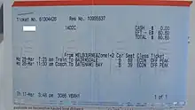 Tickets have the origin and destination printed upon them, making them point to point, but the fare itself is based on charging zones.[89] Changes were made to the fare system, to integrate it with the suburban Metcard system in preparation for the introduction of the Myki smartcard system to cover the entire state.[90]