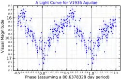 V1936 Aquilae is a blue supergiant and candidate Luminous blue variable located in the nebula Westerhout 51, in the constellation Aquila, about 20,000 light years away. The star was originally identified as a massive star in 2000,[3] and was thought to be an O-type supergiant. However, subsequent analyses have shown it to be not O but B-type,[5] as well as being possibly an LBV.[4]
