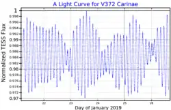 V372 Carinae is a single[9] star in the southern constellation of Carina. Located around 1300 light-years distant. It shines with a luminosity approximately 1742 times that of the Sun and has a surface temperature of 14132 K.[7] It is a Beta Cephei variable.[4]