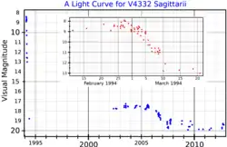 ![]() A visual band light curve for V4332 Sagittarii. The main plot, adapted from Tylenda et al. (2015),[1] shows the long-term variability, and the inset, adapted from Martini et al. (1999),[2] shows the variation during the first weeks of the eruption. | |