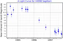 V4998 Sgr's high mass compresses its core and accelerates fusion primarily by the CNO cycle which leads to a luminosity of about 4,000,000 L☉ and a temperature of 12000 K. It boasts a large ejection nebula with a diameter of about 0.8 parsec (2.5 ly) and a mass of 6.2 M☉.[4] Since comparable nebulae typically last no more than 10,000 years, V4998 Sagittarii is presumed to have undergone a massive eruption 5000-10,000 years ago.[4]