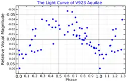 ![]() A photoelectric (yellow) light curve for V923 Aquilae, plotted from data presented by Lynds (1960).[1] The length of a full phase cycle is 0.8518 days. | |