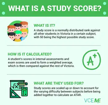 Students will be eligible for a study score of between 0 and 50 if they have completed at least two Graded Assessments, and have satisfactorily completed both units 3/4 of a VCE study. Study scores are calculated by VCAA, and indicate a student's performance in relation to all other students who undertook that study.