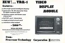 The Processor Technology VDM-1, for Video Display Module, was the first video card for S-100 bus computers.[1] Created in 1975, it allows an S-100 machine to produce its own display, and when paired with a keyboard and their 3P+S card, it eliminates the need for a separate video terminal. Using a 7 x 9 dot matrix and ASCII characters, it produces a 64-column by 16-row text display.