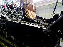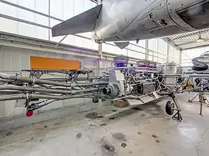 The aircraft was based on a trapezoidal frame without any skin panels. Deviating from the vectored thrust engine concept of the VAK 191B, five Rolls-Royce RB.108 turbojet lift engines with 9 kN (2,000 lbf) thrust each were mounted vertically. In addition to extensive sensor equipment, the rig used an auxiliary gas turbine for autonomous electrical power supply supply, it was also fitted with a Martin-Baker ejection seat.[3]