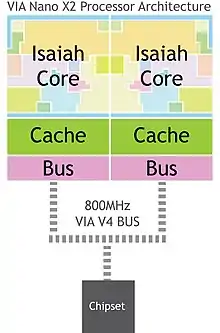The VIA Nano (formerly code-named VIA Isaiah) is a 64-bit CPU for personal computers. The VIA Nano was released by VIA Technologies in 2008 after five years of development[1] by its CPU division, Centaur Technology. This new Isaiah 64-bit architecture was designed from scratch, unveiled on 24 January 2008,[2][3][4][5] and launched on 29 May, including low-voltage variants and the Nano brand name.[6] The processor supports a number of VIA-specific x86 extensions designed to boost efficiency in low-power appliances.