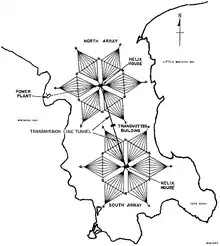 The extensive antenna system consists of two separate identical umbrella antenna arrays, designated the “north array” and the “south array”. Each array consists of a ring of 13 tall metal masts connected at the top by a network of horizontal cables. The cables form six diamond-shaped (rhombus) "panels" radiating from the central tower in a hexagonal pattern of rhombuses, configured in a snowflake shape. The two arrays normally operate together as one antenna, but each is designed to function independently to allow maintenance on the other array. The central tower of each antenna system is 304 m (997.4 ft) tall. It is surrounded by six 266.7 m (875 ft) tall masts, placed on a ring with a radius of 556 m around the central tower. The remaining six towers of the array are 243.5 m (799 ft) tall, placed on a circle of 935.7 m (3,070 ft) around the central tower.[2]