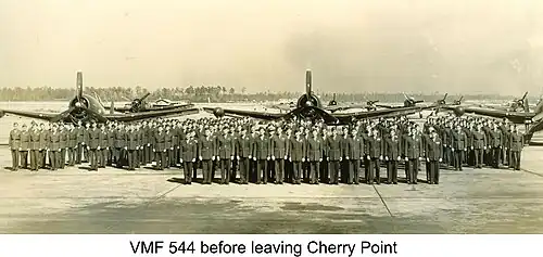 Marine Night Fighter Squadron 544 (VMF(N)-544) was commissioned on May 1, 1944 at Marine Corps Air Station Cherry Point, North Carolina.[1] The squadron immediately began training for aerial combat at night and in poor weather and low visibility. The squadron moved to Marine Corps Air Station El Centro, California in early November 1944, where it continued training for two more months.[2]