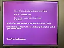 In the event of a hardware error, the vmkernel can catch a Machine Check Exception.[23] This results in an error message displayed on a purple diagnostic screen. This is colloquially known as a purple diagnostic screen, or purple screen of death (PSoD, cf. blue screen of death (BSoD)).