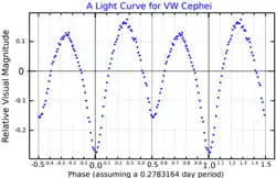 VW Cephei (VW Cep) is an eclipsing contact binary of W Ursae Majoris-type located roughly at 90.6 light years from the Sun, whose two component stars share a common outer layer. Because the two components share their outer layers, as the components of W Ursae Majoris do, they have the same stellar classification, and are classified as yellow G-type main sequence dwarfs. The components take 0.2783 days (roughly 6.7 hours) to revolve around a common barycentre. Orbital period variations suggest the presence of one more additional perturbing objects of likely low-mass stellar nature.