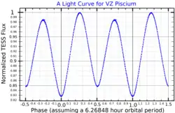 VZ Piscium is a binary star system in the equatorial constellation of Pisces. it is located at a distance of 178 light years from the Sun based on parallax measurements,[2] and has an apparent visual magnitude of about 10.3.[3][9] This is an eclipsing binary system that undergoes shallow eclipses; the brightness decreases to magnitude 10.45 during the primary eclipse, then to magnitude 10.43 with the secondary eclipse, although as a contact binary the brightness varies continuously with no period of constant maximum brightness.[3] The system is drifting closer with a radial velocity of approximately −4 km/s,[6] and has a net heliocentric velocity of 144.1 km/s.[9]