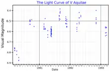 V Aquilae is a variable star of type SRb.[10] It has a published period of 400 days, but other periods are found including 350 days and 2,270 days.[14]