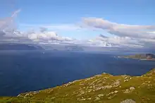 Måløy attained city status in 1997. It lies along the Ulvesundet strait on the island of Vågsøy, and is joined to the mainland by the 1,224-metre (4,016 ft) long Måløy Bridge, a structure that forms a gateway for all seagoing traffic. The Coastal Steamer (Hurtigruten) has daily departures.[5] The old part of the city lies on the island of Moldøen, from which the city that has expanded onto the mainland and further west to Holvik, has its name.