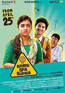 Vaayai Moodi Pesavum (transl. Speak with the mouth shut) is a 2014 Indian Tamil-language satirical romantic comedy film directed by Balaji Mohan.[1] Produced by Varun Manian and S. Sashikanth under their respective production houses, Radiance Media Group and YNOT Studios, the film stars Dulquer Salmaan, in his maiden Tamil film, with Nazriya Nazim as female lead role while Madhoo, appearing in prominent role. It was filmed simultaneously in Tamil and Malayalam, the latter being titled as Samsaaram Aarogyathinu Haanikaram (transl. Speaking is injurious to health) with a slightly changed supporting cast.