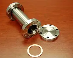 CF (ConFlat) flanges use an oxygen-free high thermal conductivity copper gasket and knife-edge flange to achieve an ultrahigh vacuum seal.[3] The term "ConFlat" is a registered trademark of Varian, Inc., so "CF" is commonly used by other flange manufacturers. Each face of the two mating CF flanges has a knife edge, which cuts into the softer metal gasket, providing an extremely leak-tight, metal-to-metal seal. Deformation of the metal gasket fills small defects in the flange, allowing Conflat flanges operate down to 10−13 Torr (10−11 Pa) pressure. The knife edge is recessed in a groove in each flange. In addition to protecting the knife edge, the groove helps hold the gasket in place, which aligns the two flanges and also reduces gasket expansion during bake-out.[4] For stainless-steel conflat flanges, baking temperatures of 450 °C can be achieved; the temperature is limited by the choice of gasket material. CF flanges are sexless and interchangeable. In North America, flange sizes are given by flange outer diameter in inches, while in Europe and Asia, sizes are given by tube inner diameter in millimeters. Despite the different naming conventions, the actual flanges are the same.