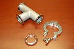 The ISO standard quick release flange is known by the names Quick Flange (QF) or Kleinflansch (KF, German which translates to "Small flange" in English).[1] The KF designation has been adopted by ISO, DIN, and Pneurop. KF flanges are made with a chamfered back surface that are attached with a circular clamp and an elastomeric o-ring (AS568 specification) that is mounted in a metal centering ring. Standard sizes are indicated by the nominal inner diameter in millimeters for flanges 10 through 50 mm in diameter.[2] Sizes 10, 20 and 32 are less common sizes (see Renard numbers). Some sizes share their flange dimensions with their respective larger neighbor and use the same clamp size. This means a DN10KF can mate to a DN16KF by using an adaptive centering ring. The same applies for DN20KF to DN25KF and DN32KF to DN40KF.