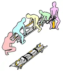 - lifting the casualty and pushing the stretcher under it. This method requires a minimum of five team members (four lifting and one pushing the stretcher) and should be used when a spine or a pelvis trauma are suspected;