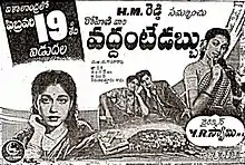 Vaddante Dabbu (transl. Endless Money)[1] is a 1954 Indian Telugu-language screwball comedy film directed by Y. R. Swamy.[2] It was produced by Moola Narayana Swamy and presented by H. M. Reddy on Rohini Pictures banner. The film stars N. T. Rama Rao, Sowcar Janaki and Jamuna, with music composed by T. A. Kalyanam. It is based on the George Barr McCutcheon novel Brewster's Millions (1902). Despite originally opening to a mixed response, it attained cult status in Telugu cinema, and was remade in the same language as Babai Abbai (1985).