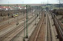 Passenger traffic at the existing station in the centre of Vaihingen was abandoned at the timetable change of 30 September 1990.[8][10] At the same time the existing line was rerouted on a 7.31 km long section and a 1.36 km long single-track branch line to Vaihingen (Enz) North was put into operation.[8]