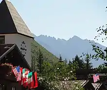 The flag of Vail is flown by government buildings and businesses in Vail. It is composed of three stripes which are light blue, white, and dark green, which represent the blue Colorado sky, white powder snow, and the surrounding Evergreen forest, respectively. Centered on the flag is the original Vail element, which consists of two "V"s, the upper to represent the surrounding mountains, while the lower represents the Vail Valley. A gold wreath surrounds the element to represent excellence and achievement.[23]