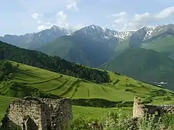 The Ingush, a nationality group indigenous to the Caucasus, mostly inhabit Ingushetia. They refer to themselves as Ghalghai (from Ingush: Ghala ("fortress" or "town") and ghai ("inhabitants" or "citizens").[25] Some scholars associate it with the ancient Gargareans[26][27][28][29] and Gelaï[30][31][32][33][34] mentioned in the 1st century in the work of the ancient historian and geographer Strabo. In Georgian sources, in the form of Gligvi, modern researchers mention them living in the Darial Gorge at the time of the deployment of Mirian I's forces into the Darial Pass in the 1st century.[35] They are also mentioned in the 18th century edition of Georgian Chronicles during the reign of Kvirike III.[36][37] In Russian sources, "Ghalghaï" first becomes known in the second half of the 16th century, in the form of "Kolkans"/"Kalkans", "Kolki"/"Kalki", "Kalkan people".[38][39][40][41]