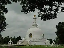 Next to the coronation tank stands the Japanese temple and the Viśvā Śānti Stūpa (World Peace Pagoda) built by the Japanese Nichiren Buddhist sect Nipponzan-Myōhōji. A small part of the Buddha's relics found in Vaiśālī have been enshrined in the foundation and in the chhatra of the Stupa.