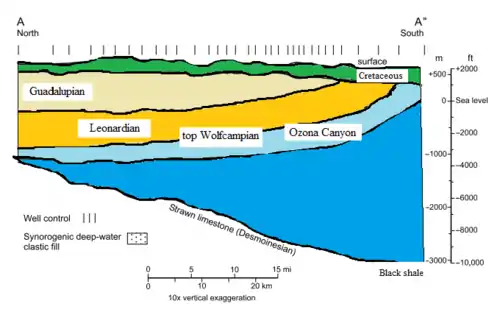 Throughout this time period, marine fauna flourished in the warm, shallow water conditions. This led to widespread carbonate deposition throughout the region.[3] Today, many basins throughout the region attribute their source rock and reservoir rock to the sedimentary deposits created during this time. As the seaway transgressed and regressed over time, alternating layers of sandstone and shale were deposited, depending on the depth and overall energy of the environment. This is when the modern-day reservoir rock of the Val Verde basin, the Ozona sequence, was deposited.