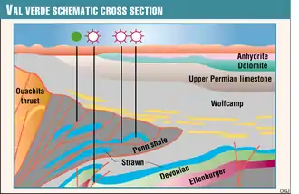 The Val Verde's structural architecture devolved mainly during the Early Carboniferous to Late Permian period during the Ouachita orogeny. This produced minor structural folding throughout the basin. Today, the Val Verde Basin is a major gas producing system and has recently been recognized for harboring over 5 tcf (trillion cubic feet) of natural gas.[2]