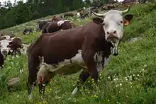 The Valdostana Pezzata Rossa is an Italian breed of cattle from Valle d'Aosta region in north-western Italy. It is red-pied, usually with white legs, stomach and face. It is one of three regional breeds in the area, the others being the Valdostana Castana and the Valdostana Pezzata Nera. Like them, it derives from inter-breeding of various local breeds and types of cattle. The most important of these were Swiss Simmental cattle, which came into the Valle d'Aosta over the Great St. Bernard Pass. The Valdostana Pezzata Rossa is a dual-purpose breed, raised mainly for milk, but also for meat. Management is normally transhumant: the cattle are stabled only in winter, and spend the summer months on the mountain pastures of the Alps.