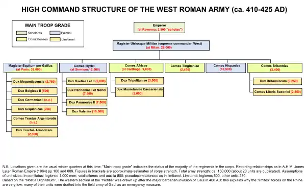 The major divisions of the late Roman army included a central force (comitatenses),[24] ready for deployment, and the forces stationed in the provinces and on the frontier (ripenses, later limitanei, lit. 'on the river banks, or frontiers')[25] under the command of a dux (lit. 'leader', pl. duces), e.g. dux Armeniae. Of these the comitatenses had the higher status and was also called praesental (Latin: praesentalis, lit. 'presence'), i.e. in the presence of the emperor.[26] The third division was the imperial bodyguard (Latin: scholae palatinae, lit. 'Palace Corps'), answering directly to the emperor, but under the magister officiorum (master of the officers). These scholae (or scolae, sing. schola or scola[27]) were cavalry units, whose names originally derived from their equipment. The scholae scutariorum (or scutarii, lit. 'shield bearers') refer to their shields (Latin: scuta, sing. scutum).[28] This was the unit from which Valentinian I, the first of the Valentinian emperors, was drawn.[29] In the armies stationed in Thracia and Illyricum the local commander had the title of comes rei militaris (lit. 'count for military affairs'), a rank between dux and magister. The organisational structure is outlined in the contemporary document, the notitia dignitatum (lit. list of the offices), a list of all the administrative positions.[lower-alpha 4][32] It became common to append the honorific comes to magistri positions.[33] The Notitia lists six comites, including comes Africae (or comes per Africam) and comes Britanniarum, responsible for the defence of Africa and Britain respectively. Other military comites include the comes et magister utriusque militiae (or comes et magister utriusque militiae praesentalis) and comites domesticorum (comes domesticorum equitum, comes domesticorum peditum).[34][35][36]