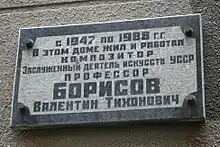 Valentyn Tikhonovich Borysov (born 20 July 1901 in Bohodukhiv; died 1988) was a Ukrainian composer.[1] In 1927 Barysov graduated from the Kharkiv National Kotlyarevsky University of Arts.