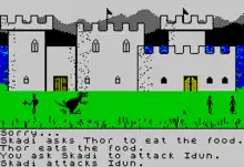 In Valhalla the characters move through various Nordic locations with accompanying text at the bottom of the screen detailing all character actions. It is set mainly in Asgard and Midgard, though when the character dies, it reappears in Hell (Niflheim under another name) and is able to walk out.