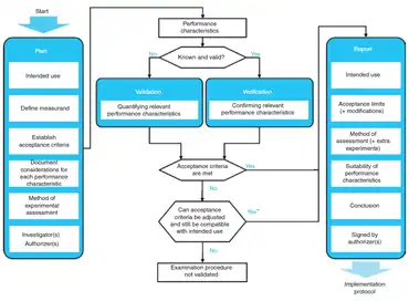 Standards for validation and verification of medical laboratories are outlined in the international standard ISO 15189, in addition to national and regional regulations.[1]