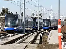 The Valley Line is a future 27 km (17 mi), low-floor urban light rail line in Edmonton, Alberta, under construction since 2016.[6][7][8] It will be part of the Edmonton Light Rail Transit. It will run southeast to west from Mill Woods to Lewis Farms, crossing through downtown. The line will be constructed in phases, with phase 1 being the 13.1 km (8.1 mi), 12-station portion between Mill Woods and 102 Street (Downtown) allowing passengers to connect with the Capital Line and Metro Line at Churchill station. Originally projected for a phase 1 opening in 2018, construction began on April 22, 2016, with completion of phase 1 tentatively set for 2020, revised to 2021, revised again to 2022, and started test runs (no passengers) in the first quarter of 2023.[3][9][10][11][12] Upon completion of the entire line, the Valley Line is expected to serve more than 100,000 commuters daily,[13] nearly matching the current Capital Line and Metro Line in terms of capacity and ridership.
