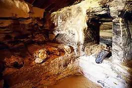 Many of the mummies were still in good condition when they were discovered by Hawass and his team. They were decorated in different styles.[2] There were four general styles of the mummies at Bahariya. The first style, which was found on approximately sixty mummies, has a gilded mask covering the face and a gilded waistcoat depicting different scenes of gods and goddesses across the chest. The second style is covered with cartonnage, depicting scenes of gods such as Anubis, the god of mummification, and his four children. The third style was not decorated with gold or cartonnage, but rather was placed inside an anthropoid, a pottery coffin. The fourth style was covered in linen.[3]