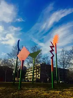 In the northern part of the park, at the access next to the 22 de julio walkway —between the Monner torrent and the Plan de la Fuente del Apotecario—, there is since 1999 the sculpture "Relaciones del espacio" (in Catalan; Relacions de l'espai.) by Àngel Màdico, a sculpture made up of five elements of different colors that contrast with the surroundings, depending on the position of the observer.[37][38] It consists of poles of more than three meters and at its end there are five different types of elements of nature and geometric shapes: the moon, the sun, the lightning bolt, a tyrangle and a rhombus in blue, yellow, red, green and pink colors, respectively.[38] According to the author, the whole is an alloy of elements that contrast between nature itself and abstraction. This contrast is chosen so that the observer creates his own composition depending on the point of view in which he is with the possibility of altering it by changing its position. The sculpture of naïve character is one of the references of the users of the park.[38]