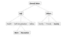 Value tree analysis is a multi-criteria decision-making (MCDM) implement by which the decision-making attributes for each choice to come out with a preference for the decision makes are weighted.[1] Usually, choices' attribute-specific values are aggregated into a complete method. Decision analysts (DAs) distinguished two types of utility.[2] The preferences of value are made among alternatives when there is no uncertainty. Risk preferences solves the attitude of DM to risk taking under uncertainty. This learning package focuses on deterministic choices, namely value theory, and in particular a decision analysis tool called a value tree.[2]