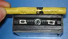 A vampire tap (also called a piercing tap) was a device for physically connecting a station, typically a computer, to a network that used 10BASE5 cabling. This device clamped onto and "bit" into the cable[1] (hence the name "vampire"), inserting a probe through a hole drilled using a special tool through the outer shielding to contact the inner conductor, while other spikes bit into the outer conductor. The vampire tap usually had an integrated AUI (Attachment Unit Interface), from which a short multicore cable connected to the network card in the station.