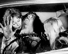 One of Vampyres' unique improvisations on the vampire genre is the decision for its vampires to feed out of a cut in the arm of victim Ted. Larraz explains his impetus behind this choice, saying, "I imagine my vampires turn almost to cannibalism, to eat somebody, to take the blood from anywhere, no matter if it is on the arm or on the balls!"[8] Film theorist Barbara Creed called this wound "one of the most grotesque sights in the film."[9]