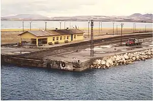 The construction of a railway to Iran, via Van, was approved on 15 June 1937. The railway would continue east from Diyarbakır to Van and to the Iranian border at Kapıköy.[1] Construction began shortly after and the railway reached Kurtalan in 1940. Due to the mountainous terrain between Kurtalan and Tatvan, the route was changed and its western starting became Elazığ. From Elazığ the railway would be built to Tatvan, via Muş, reaching Tuğ in 1964.[2] A train ferry was established as a temporary means of transport between Tuğ and Van, as a bypass of Lake Van was planned.[3]