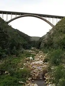 Just upstream of the N2 bridge, the 60 cm (2 ft) gauge Avontuur Railway crosses the Van Stadens River over a 78 m (255 ft) high bridge.[3]