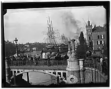 On 3 February 1863, there was a public tender for the iron dock in the East Indies. It would be stationed at Onrust (island) near Batavia. Of 17 contestants Van Vlissingen en Dudok van Heel was the cheapest at 366,685 guilders.[55] The floating dock was 90 m long, and up to 21 m wide on the inside. It would be able to load a screw frigate of 3,000 tons.[56] On 9 June 1864 some members of the Royal Institute of Engineers visited the floating dock after attending their annual meeting. Van Vlissingen en Dudok van Heel made pictures and sent them to the members of the institute.[57] The final cost of the floating dock would be 460,852 guilders, of those 41,018 were for transport.[56] After transport to Surabaya the floating dry dock was re-assembled in a basin at Surabaya from 3 April 1865. In October 1869 it was finally towed to Onrust by the Amsterdam and Ardjoeno.[58] It would have a remarkable long life, serving up to 1933.