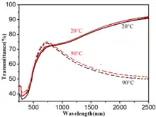 Undoped and tungsten-doped vanadium dioxide films can act as "spectrally-selective" coatings to block infrared transmission and reduce the loss of building interior heat through windows.[33][34][35] Varying the amount of tungsten allows regulating the phase transition temperature at a rate of 20 °C (20 K) per 1 atomic percent of tungsten.[33] The coating has a slight yellow-green color.[36] The performance of energy-saving smart windows can be enhanced by combining VO2 with antireflection layers.[37] The technology of low-temperature preparation of V1-xWxO2-based multilayers has been scaled up to industrial dimensions.[38]