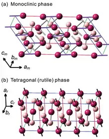 | Distorted rutile (<70 °C (343 K), monoclinic) Rutile (>70 °C (343 K), tetragonal) | |