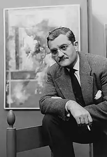 ![]() Vance Kirkland in his Denver studio, 1957. Behind him is his 1956 painting Villa dei Misteri. | |