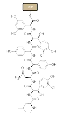 Nonribosomal peptide synthesis occurs through distinct modules that can load and extend the protein by one amino acid per module through the amide bond formation at the contact sites of the activating domains.[49] Each module typically consists of an adenylation (A) domain, a peptidyl carrier protein (PCP) domain, and a condensation (C) domain. In the A domain, the specific amino acid is activated by converting into an aminoacyl adenylate enzyme complex attached to a 4'phosphopantetheine cofactor by thioesterification[50][51] The complex is then transferred to the PCP domain with the expulsion of AMP. The PCP domain uses the attached 4'-phosphopantethein prosthetic group to load the growing peptide chain and their precursors.[52] The organization of the modules necessary to biosynthesize Vancomycin is shown in Figure 1. In the biosynthesis of Vancomycin, additional modification domains are present, such as the epimerization (E) domain, which isomerizes the amino acid from one stereochemistry to another, and a thioesterase domain (TE) is used as a catalyst for cyclization and releases of the molecule via a thioesterase scission.