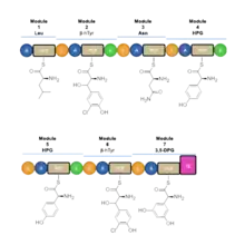 A set of NRPS enzymes (peptide synthase VpsA, VpsB, and VpsC) are responsible for assembling the heptapeptide. (Figure 2).[49] VpsA codes for modules 1, 2, and 3. VpsB codes for modules 4, 5, and 6, and VpsC codes for module 7. The vancomycin aglycone contains 4 D-amino acids, although the NRPSs only contain 3 epimerization domains. The origin of D-Leu at residue 1 is not known. The three peptide syntheses are located at the start of the region of the bacterial genome linked with antibiotic biosynthesis, and span 27 kb.[49]